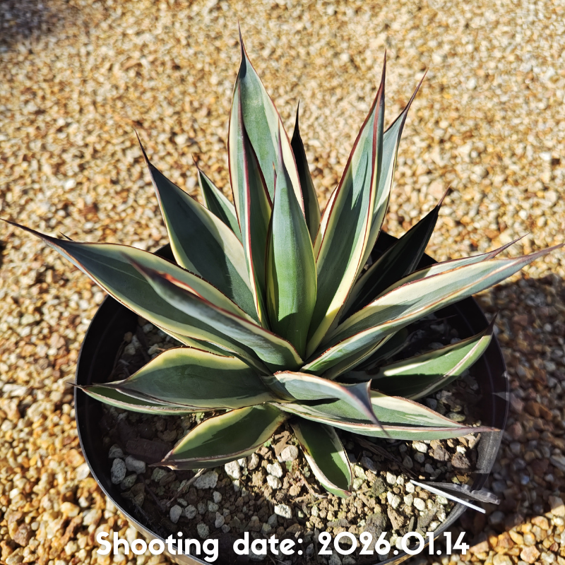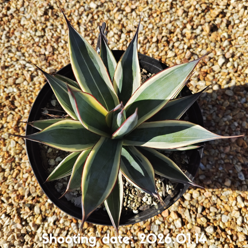 ブルーグロウの斑入り品種で青緑の葉にアイボリーからクリーム色の覆輪が入り赤いエッジが特徴のアガベです