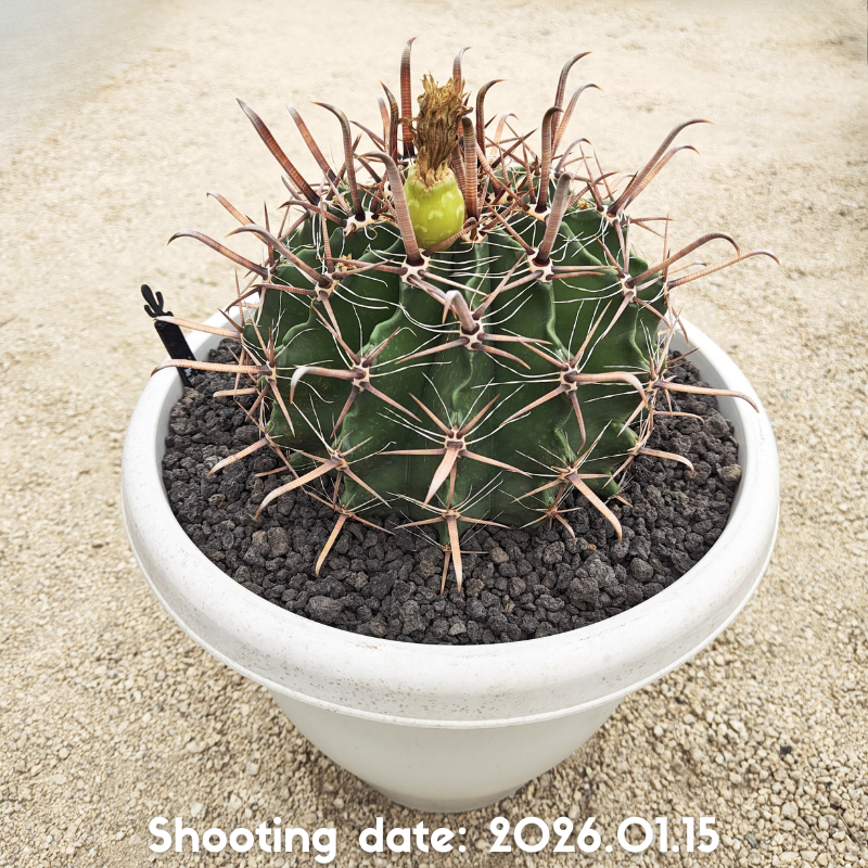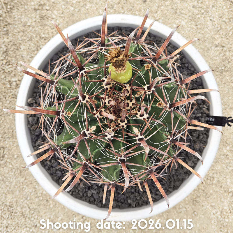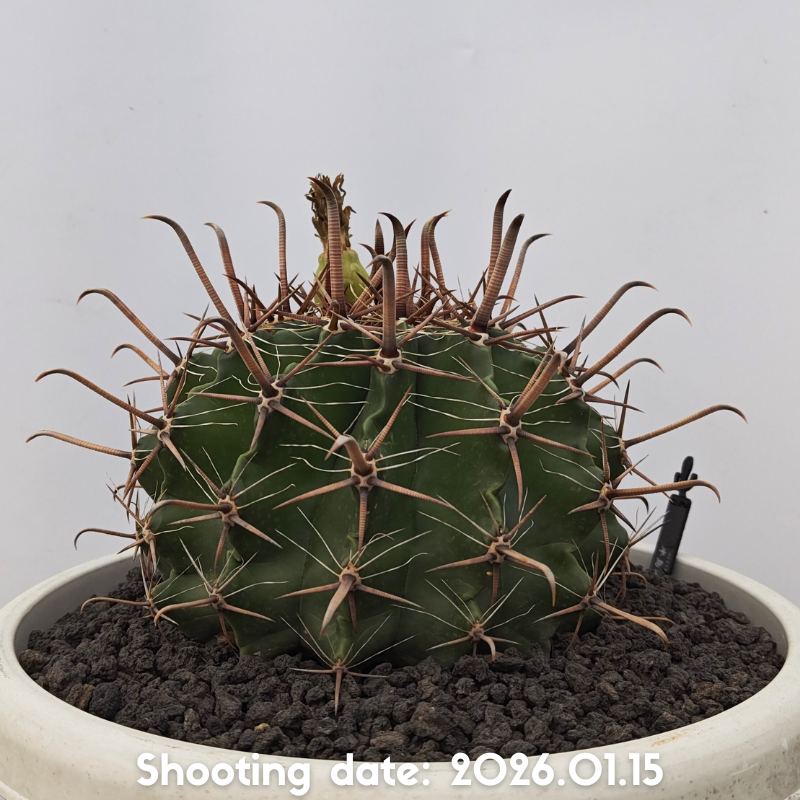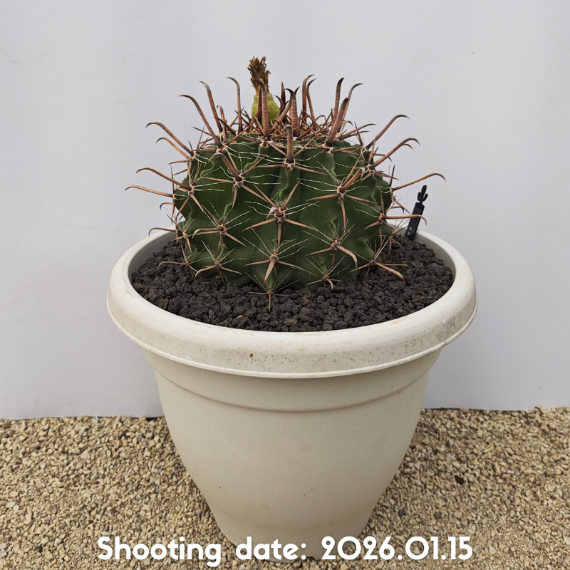 白粉を帯びた暗緑色の肌で中刺がフック状の強刺が特徴のフェロカクタスです