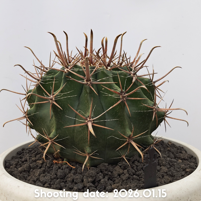 白粉を帯びた暗緑色の肌で中刺がフック状の強刺が特徴のフェロカクタスです