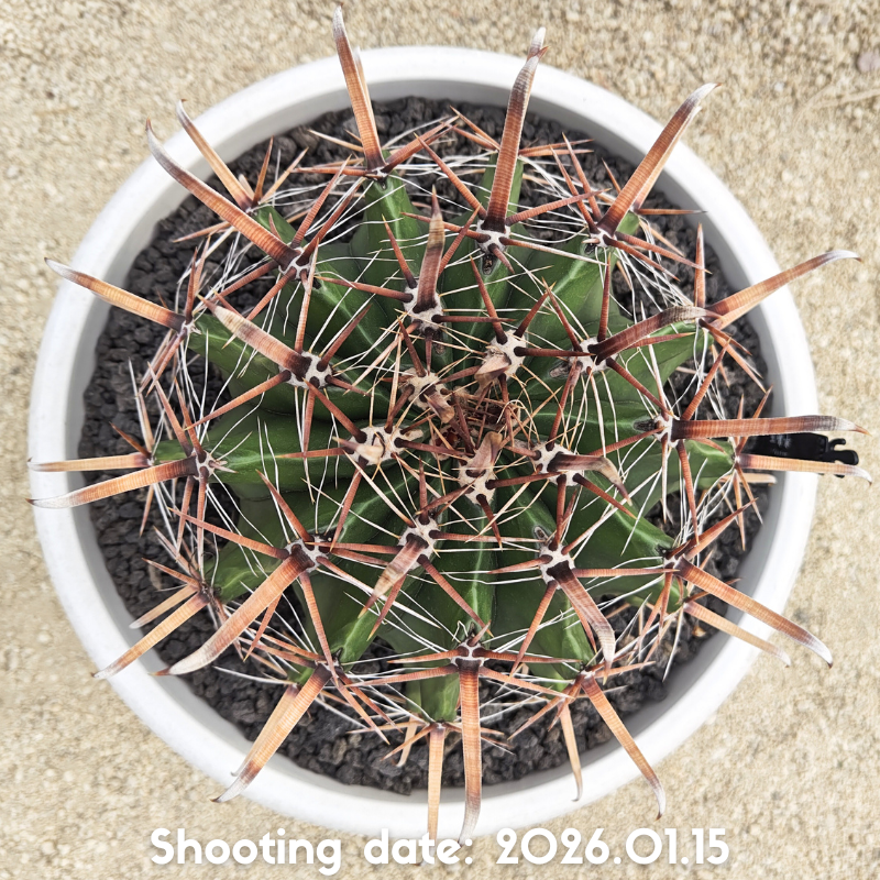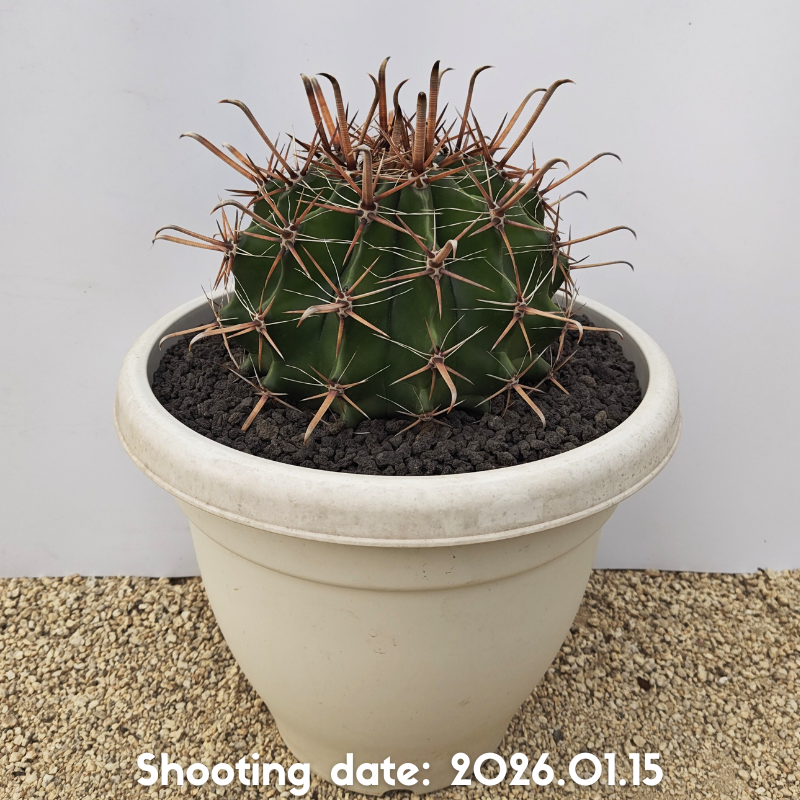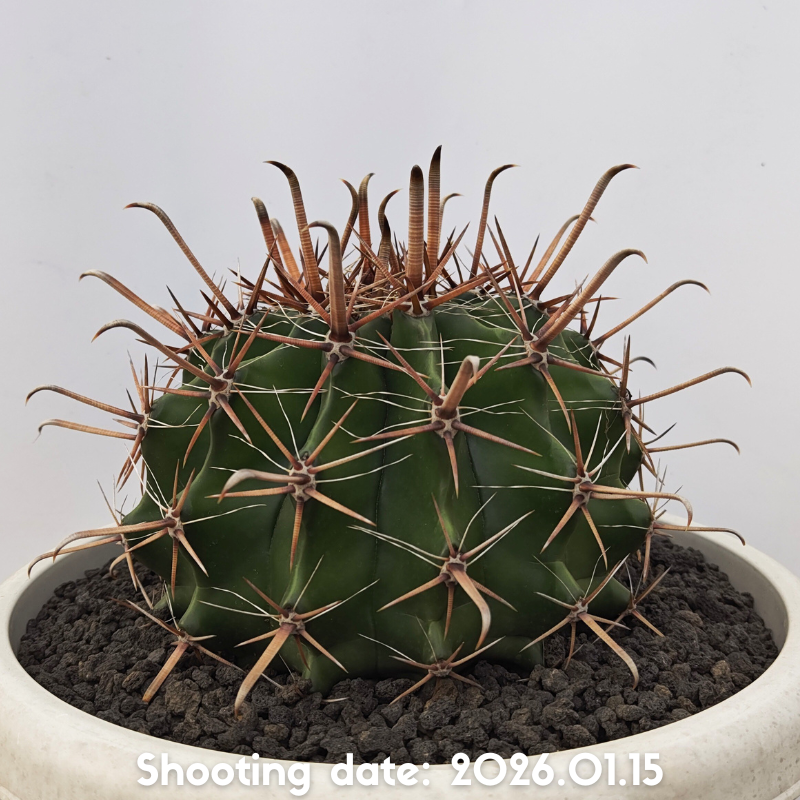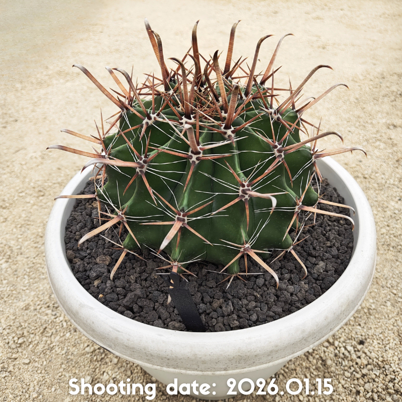 白粉を帯びた暗緑色の肌で中刺がフック状の強刺が特徴のフェロカクタスです