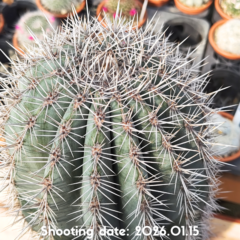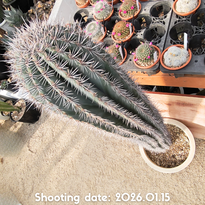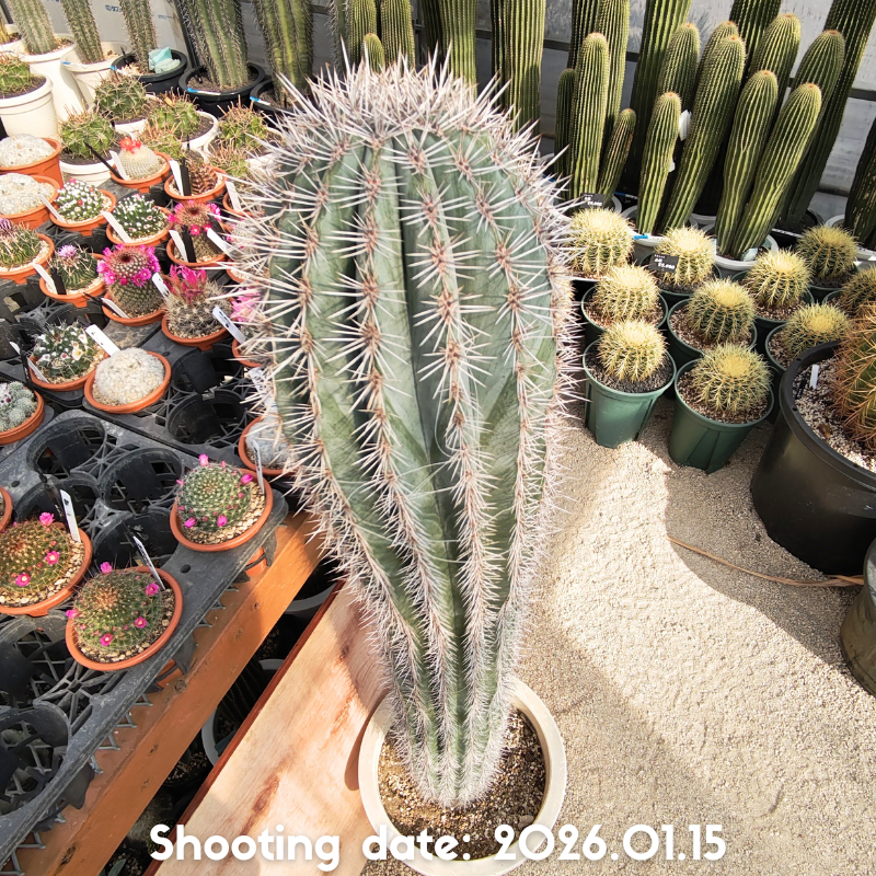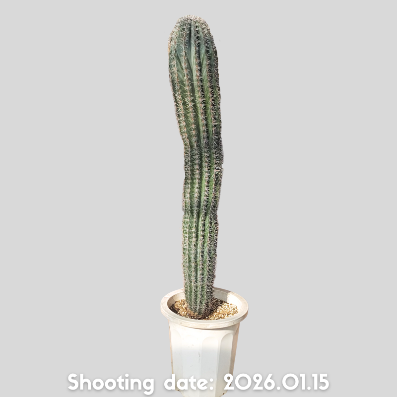 濃緑から灰緑色の肌と長さの揃った刺を持つ美しい柱サボテンです