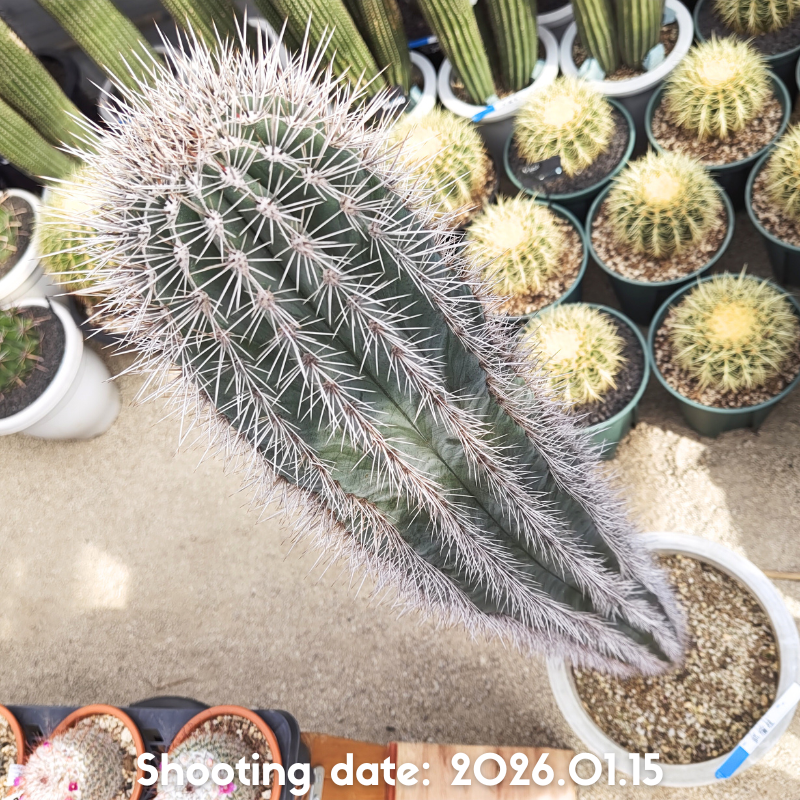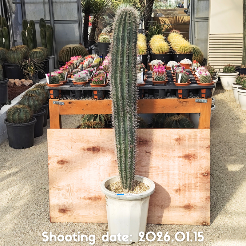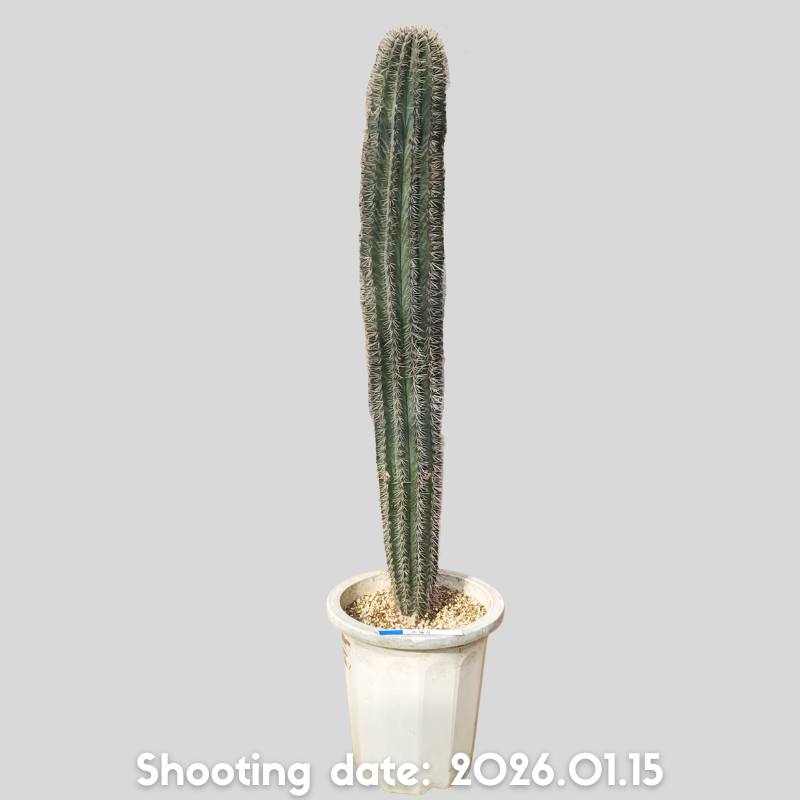 濃緑から灰緑色の肌と長さの揃った刺を持つ美しい柱サボテンです