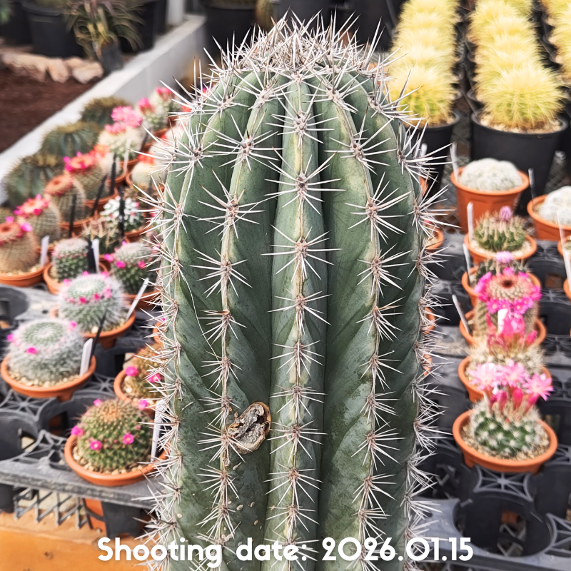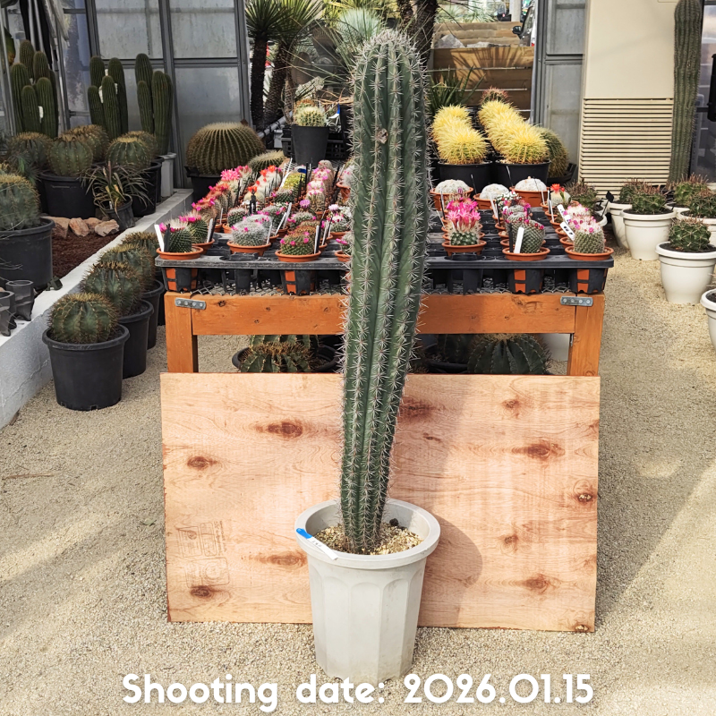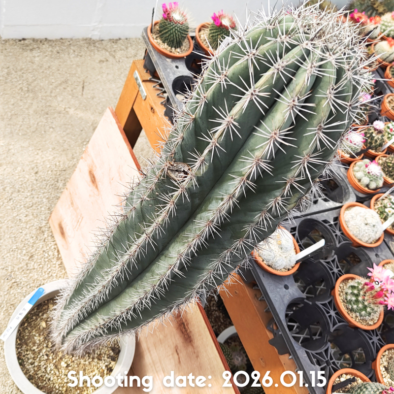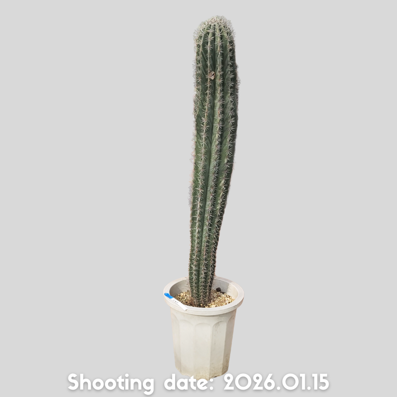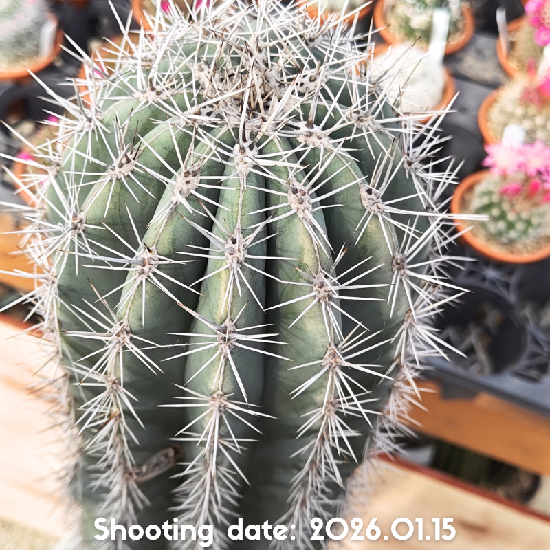 濃緑から灰緑色の肌と長さの揃った刺を持つ美しい柱サボテンです