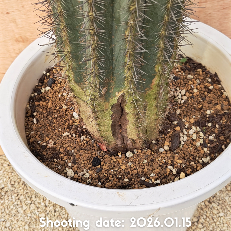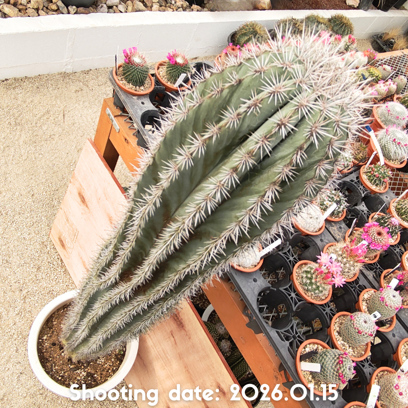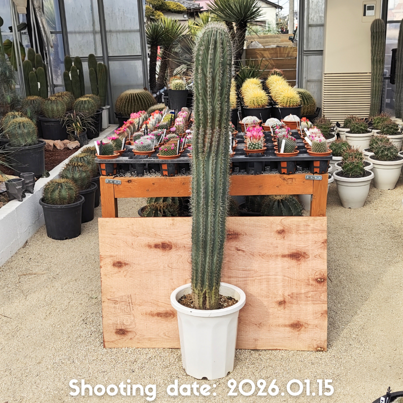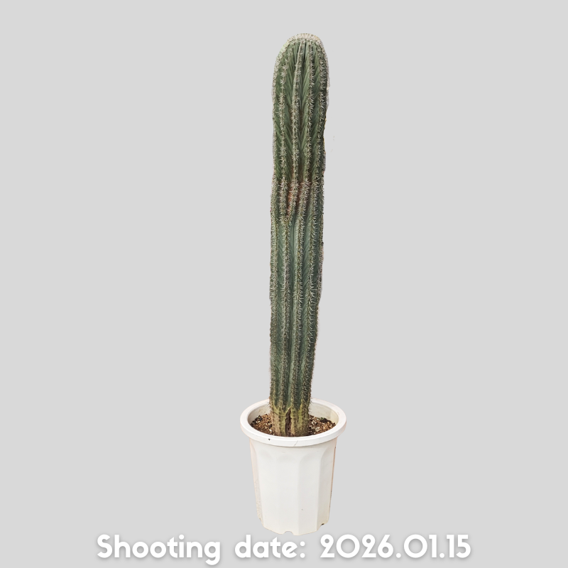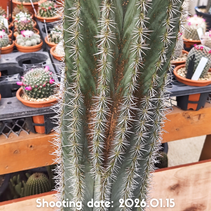 濃緑から灰緑色の肌と長さの揃った刺を持つ美しい柱サボテンです