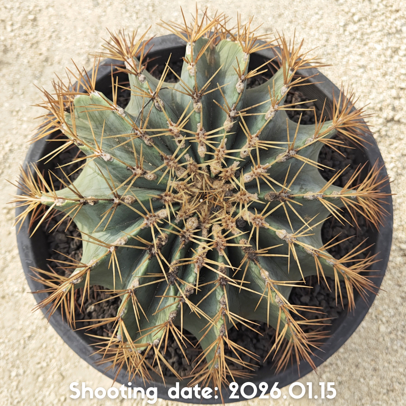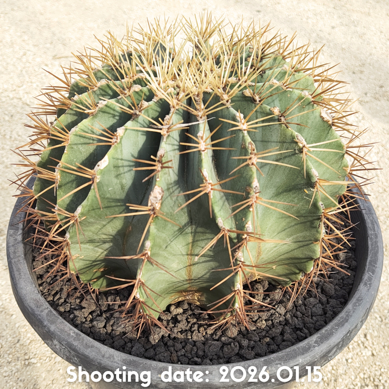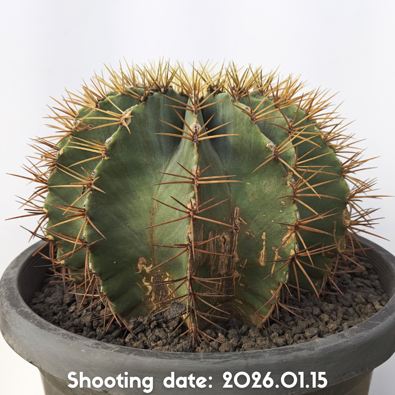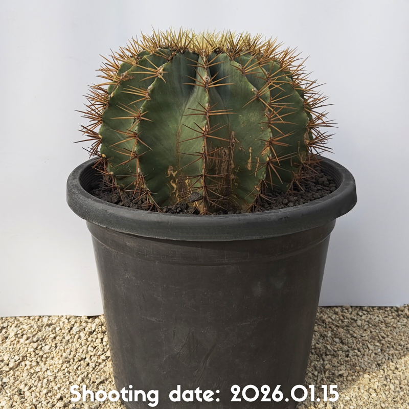 青緑色の肌に黄金の棘が美しいフェロカクタスです