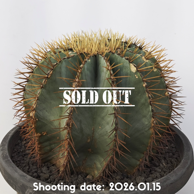 青緑色の肌に黄金の棘が美しいフェロカクタスです