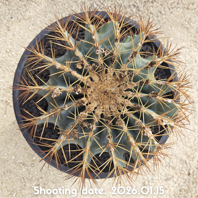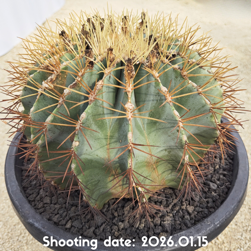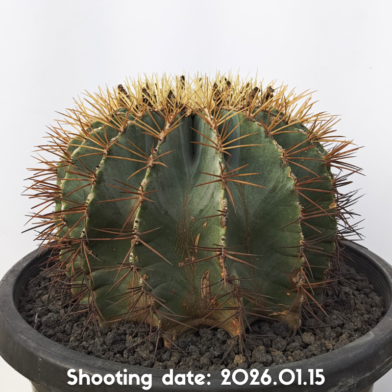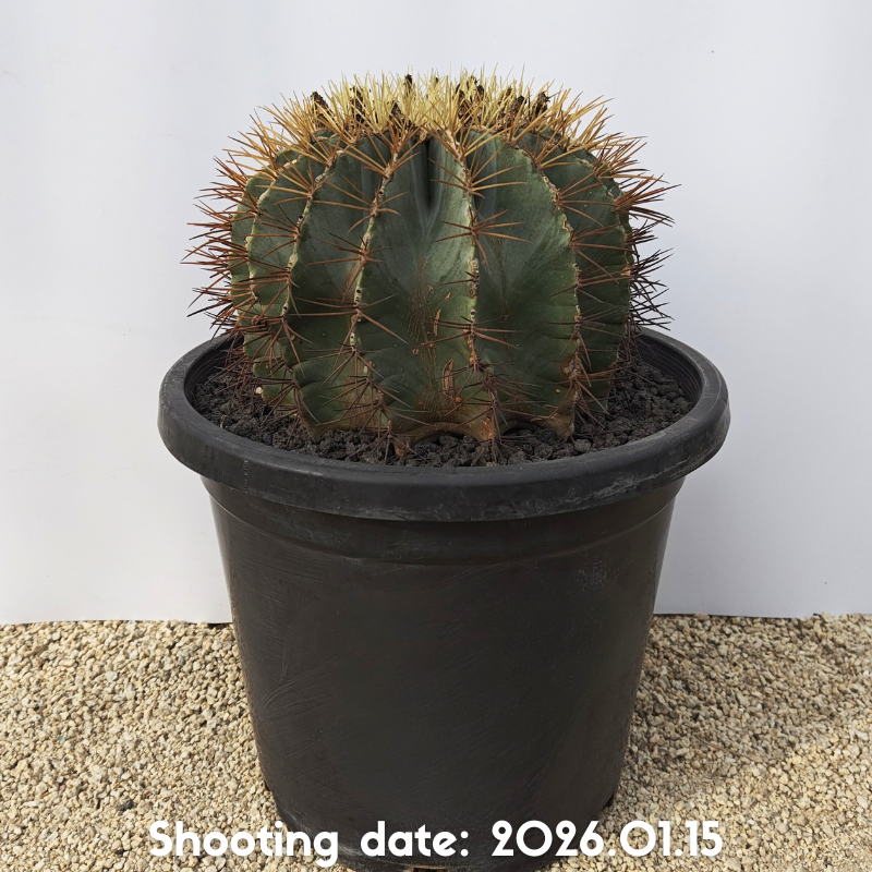 青緑色の肌に黄金の棘が美しいフェロカクタスです
