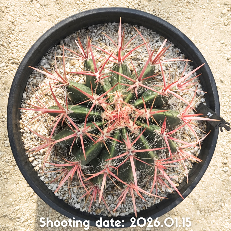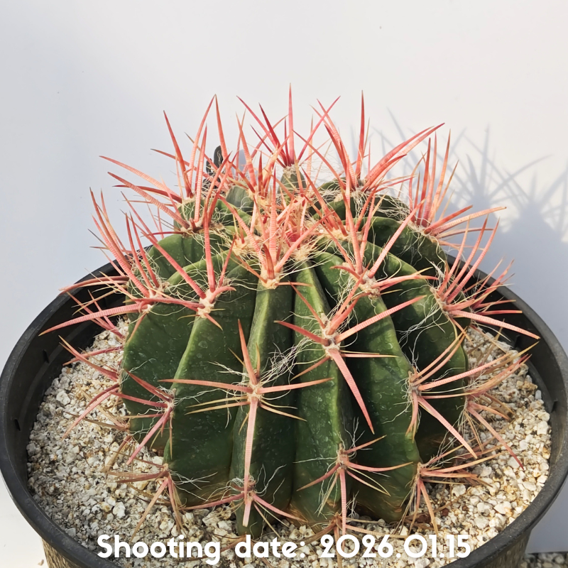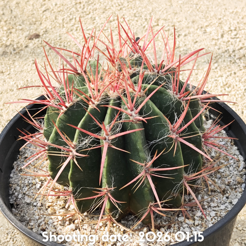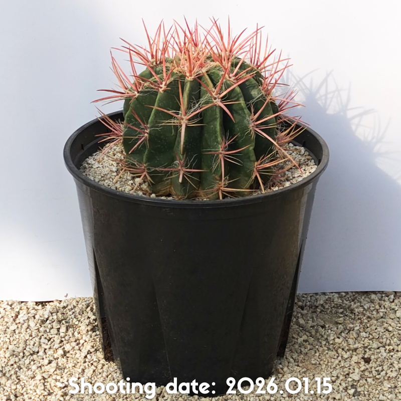 成長過程で深紅へと変化していくこともある太くて鮮やかな赤刺が特徴のフェロカクタスです